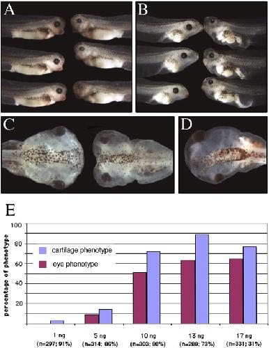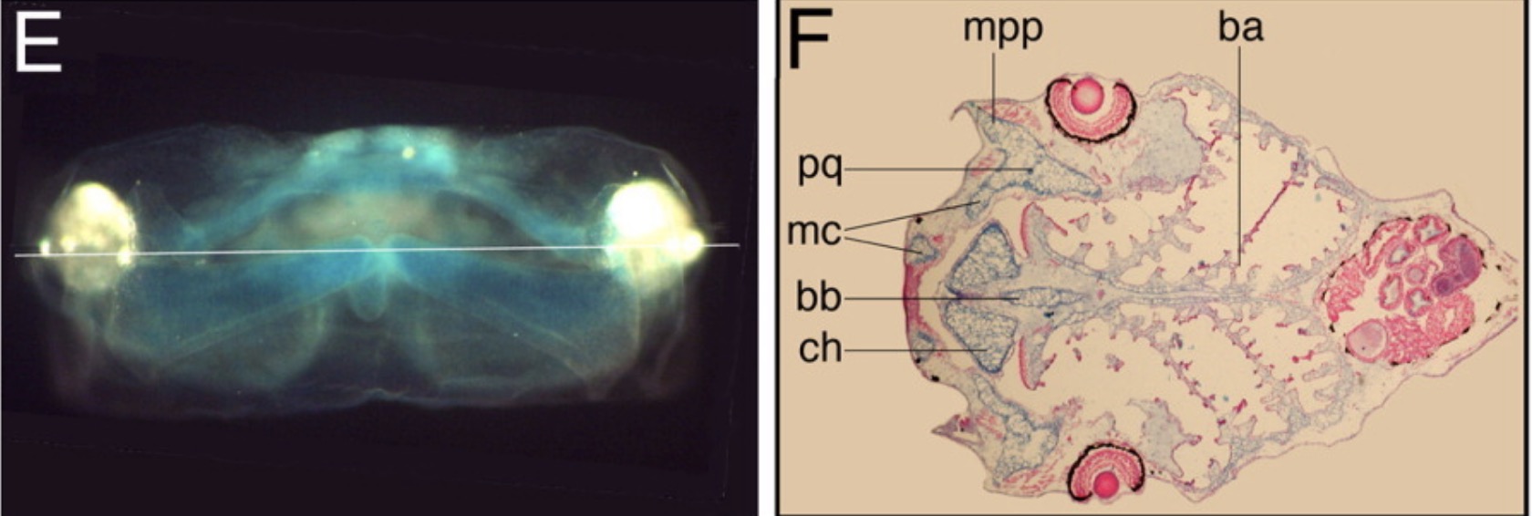 Cranial structures in Xenopus. E. Frontal view and F. section of Alcian blueâstained section through head of wildâtype Xenopus embryo at NF stage 48.