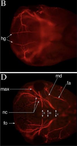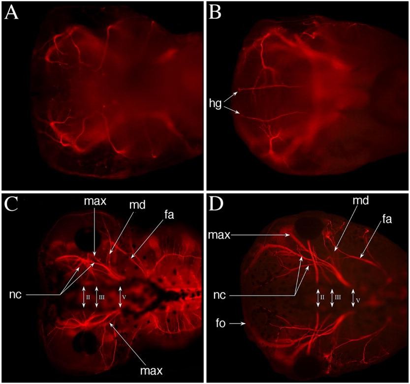 Cranial nerves in Xenopus embryo, at NF stage 48. B: Ventral view, D:Dorsal view on wildâtype embryo.