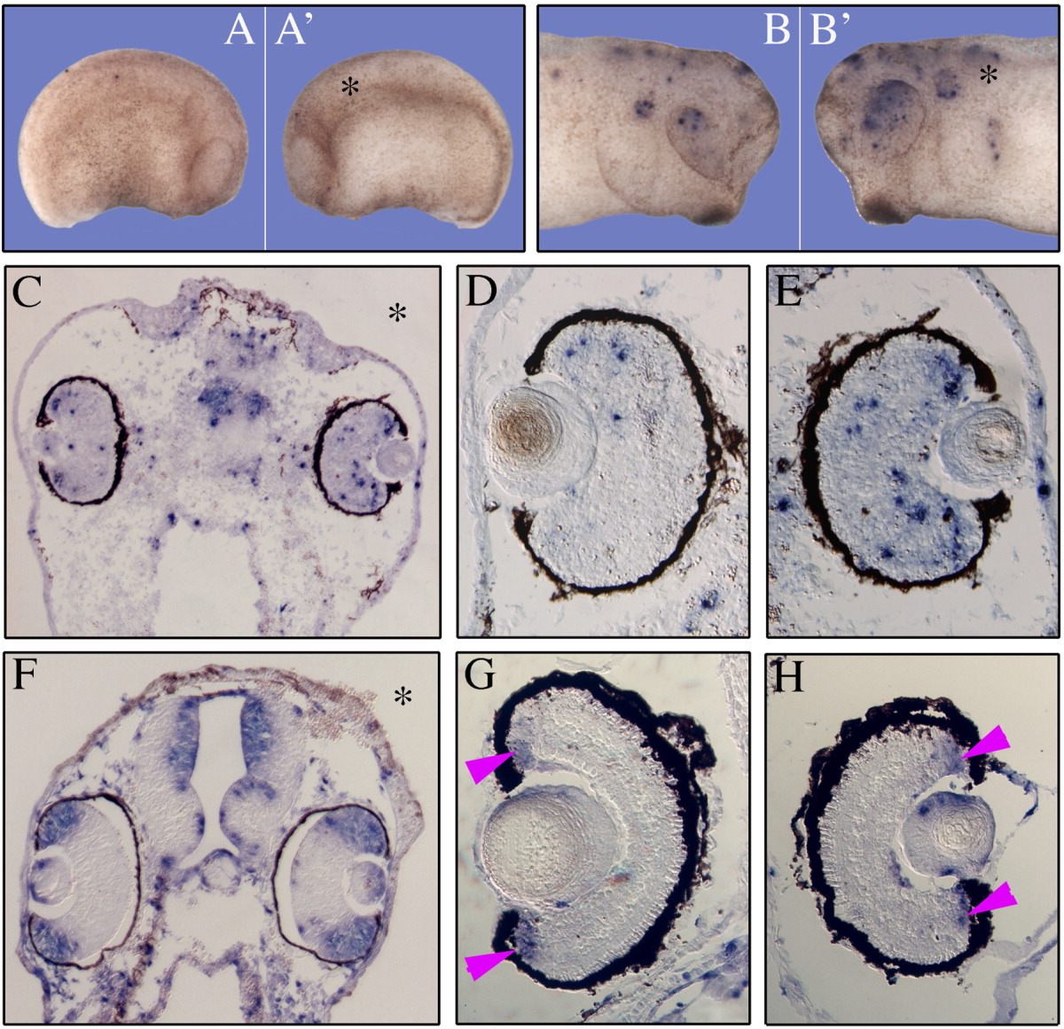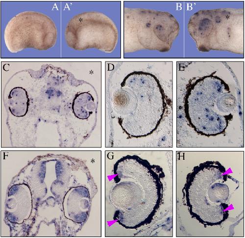 Figure 8. Analysis of apoptosis and cell proliferation in FoxN3‐depleted embryos. Embryos were co‐injected with 13 ng FoxN3‐MO and 200 pg GFP RNA into one blastomere at 2‐cell stage. An asterisk denotes the injected side of embryos. A, A': Left and right view on an unilaterally FoxN3‐MO‐injected and TUNEL‐stained embryo at stage 24. A' shows the injected side. Almost no apoptotic cells can be observed on either side. B, B': Left and right view on the head of an unilaterally FoxN3‐MO‐injected and TUNEL‐stained embryo stage 32. The injected side (B') shows a higher rate of apoptosis than the uninjected side (B). C: Section of an unilaterally FoxN3‐MO‐injected embryo at stage 41. An increased number of apoptotic cells is found on the injected side, especially within the eye. D, E: Tissue sections of the eye of a unilaterally injected embryo at stage 41. The eye of the injected side (E) shows an increase of apoptosis in the retina as compared to the uninjected side (D). F–H: Tissue sections of unilaterally injected embryos analysed by BrdU immunohistochemistry. F: Section of the head of an embryo at stage 39/40. No difference in the proliferation rate of the injected side in comparison to the uninjected side can be observed. G, H: Sections of BrdU stained eyes of an unilaterally injected embryo at stage 45. The labeled cells of the retina indicate the ciliary marginal zone (arrowheads), but are equally stained in the uninjected (G) and in the FoxN3‐MO‐injected side (H). |