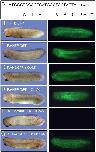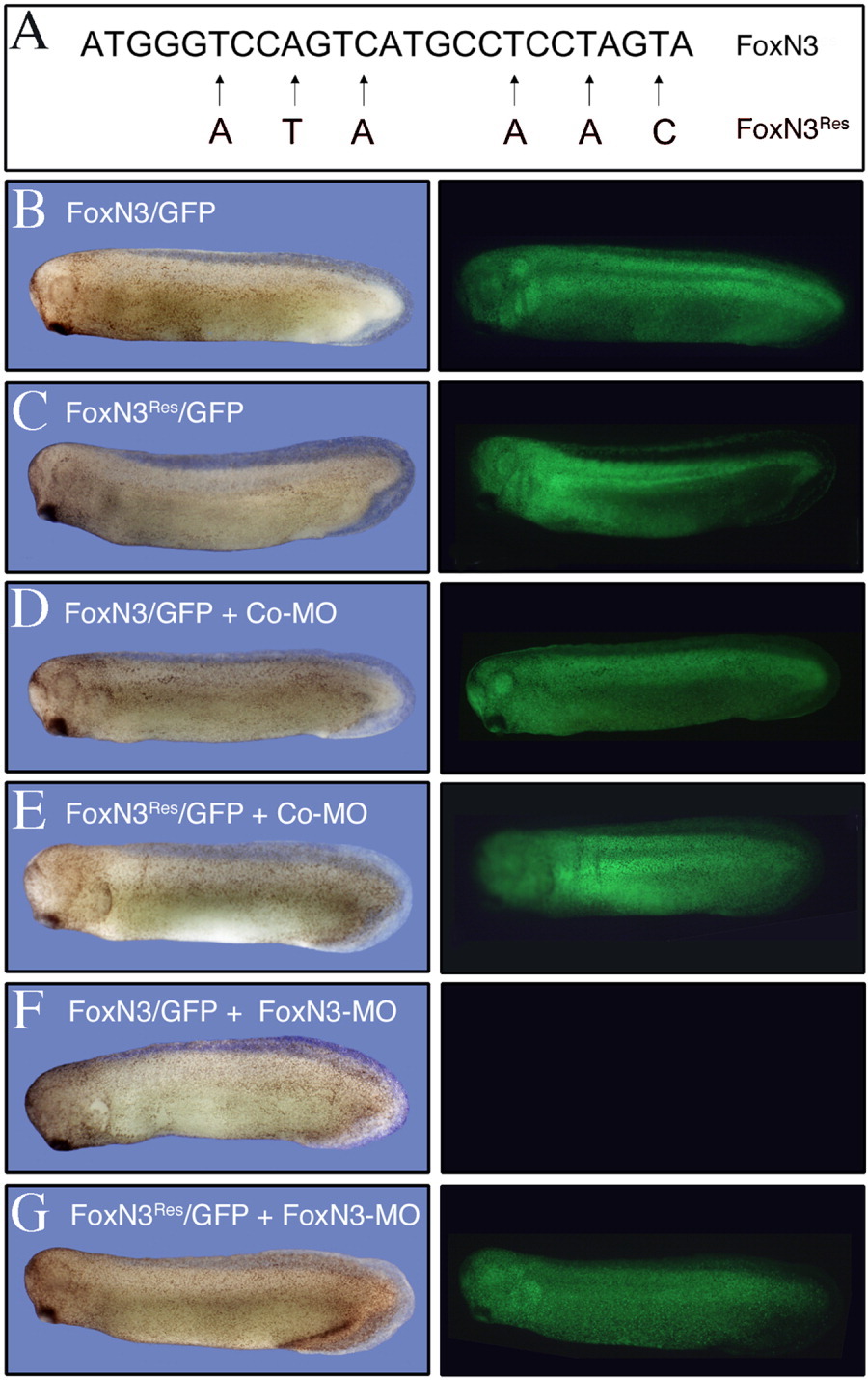 Figure 1. Inhibition of in vivo translation of a FoxN3/GFP fusion construct by FoxN3âMO. The 5â²âcoding sequence (300 bp) of FoxN3 including the translation start codon were fused to GFP (FoxN3/GFP). Alternatively, six silent mutations in the putative morpholino binding site were introduced (FoxN3Res/GFP). RNA of these constructs was injected into both blastomeres at the 2âcell stage and embryos were analysed at stage 31. A: 5â²âcoding sequence (25 bp) of FoxN3 is reverse complementary to the FoxN3 morpholino (FoxN3âMO) sequence. Silent mutations in the FoxN3Res/GFP construct are indicated. B,D,F: Lateral views on embryos injected with 0.5 ng FoxN3/GFP RNA (B), coâinjected with 13 ng CoâMO (D) or with 13 ng FoxN3âMO (F) into each blastomere. C,E,G: Lateral views on embryos injected with 0.5 ng FoxN3Res/GFP RNA containing the silent mutations (C), coâinjected with 13 ng CoâMO (E) or with 13 ng FoxN3âMO (G) into each blastomere. Embryos are photographed under normal light (left) and under UV light (right). Fluorescence is visible in embryos with FoxN3Res/GFP RNA injection and FoxN3âMO (G), but not with FoxN3/GFP RNA and FoxN3âMO (F). |