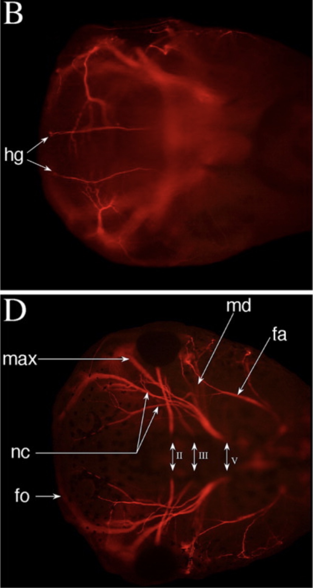 Key: fa, nervus facialis [facial nerve]; fo, nervus frontalis; hg, nervus hypoglossus [hypoglossal nerve]; max, nervus maxillare; md, nervus mandibulare; nc, nervus nasociliaris. Roman numbers indicate the cranial nerves: cranial nerve II [optic nerve]), cranial nerve III (oculomotorius) [oculomotor nerve], and cranial nerve V (trigeminus) [trigeminal nerve]. |