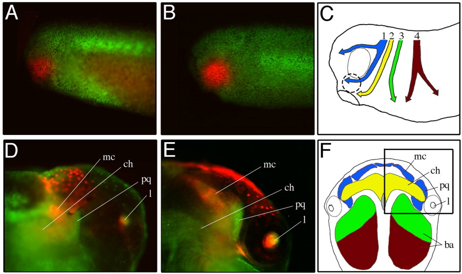 Schematic representation of cranial neural crest cell migration pathways during embryogenesis (C) at stage 26, and (F) tissue to which they contribute. Cartilage structures (ventral view) at stage 48 (modified from: Sadaghiani and Thiebaud, 1987; Baltzinger et al., 2005). The rectangle in F denotes the area seen in D and E. 1, mandibular arch (blue); 2, hyoid arch (yellow); 3, anterior branchial arch (green); 4, posterior branchial arch (brown). ba, branchial arch; ch, ceratohyale; l, lens; mc, Meckel's cartilage; pq, palatoquadrate. Image extracted from Figure 7, XB-ART-34864. |
