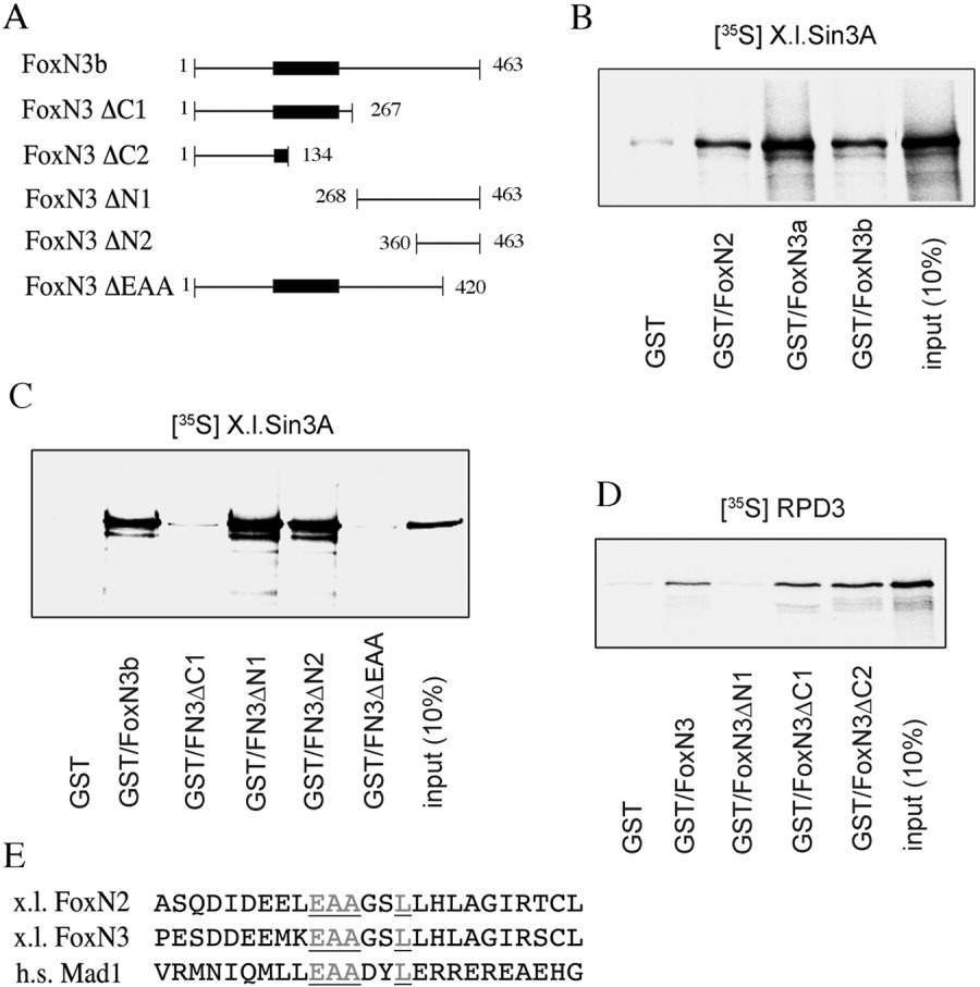 Figure 9. FoxN3 interacts with components of the histone deacetylase complex (HDAC). A: Scheme of FoxN3 deletion constructs used for GST‐pull down assays. The fork head/winged helix domain is indicated by a black box. B: [35S] methionine‐labeled Sin3 protein was incubated with GST‐fusions of the two isoforms of FoxN3 or with GST‐FoxN2, respectively. The pull‐down reactions were analysed using a 10% SDS‐PAGE. C: Pull‐down analysis of GST‐FoxN3 deletion mutants with [35S] methionine‐labeled Sin3 protein. Sin3 requires for binding the C‐terminus of FoxN3 but not the N‐terminus. D: [35S] methionine‐labeled RPD3 protein was incubated with GST‐FoxN3 mutants. RPD3 binds to N‐terminal, but not to C‐terminal region of FoxN3 deletion constructs. E: Alignment of putative Sin3 binding sites of FoxN2, FoxN3, and human Mad1 (see: van Ingen et al., 2004). Conserved amino acids are underlined and shown in grey. |