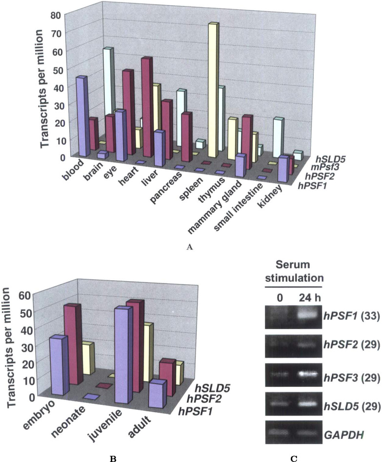Fig. 1. Expression profiles of GINS genes. A search was conducted based on the EST counts in human/mouse tissues (A) and during the developmental stages (B) in the UniGene database (EST Profile Viewer, NCBI). The datasets used for PSF1, PSF2, Psf3, and SLD5 genes were Hs. 360033, Hs. 433180, Mm. 35546, and Hs. 521557, respectively. The number of transcripts per million was calculated from the gene EST/total EST in the pool. C. Semi-quantitative RT-PCR analysis of the transcripts of GINS genes in Saos-2 cells after serum stimulation for 24 h. The number of PCR cycles is shown in parentheses. The housekeeping gene, GAPDH, was used as the control.
