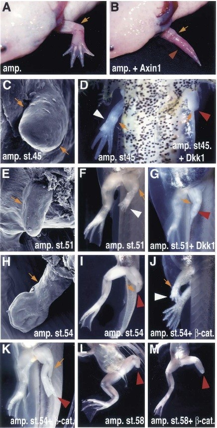 Figure 1. Wnt/Beta-catenin signaling is required for limb regeneration in axolotls and Xenopus. (A) Gross morphology and scanning electron microscope (SEM) images of adult (A,B) and larvae (C,D) axolotls. (A) A fully regenerated wild-type adult axolotl forelimb develops 2 mo after amputation at the elbow level. (B) Microinjection of Ad-Axin1 after forelimb amputation prevented regeneration of the distal elements (red arrowhead). (C) SEM image of an axolotl larvae limb at the stage at which amputation was performed (stage 45). (D) Ventral view of axolotl larvae limbs 1 mo after amputation and virus injection. The right amputated limb regenerated normally (reader left side, white arrowhead), while the left amputated limb, injected with Ad-Dkk1, did not regenerate (reader right side, red arrowhead). (E) Gross morphology and SEM images of Xenopus larvae hindlimbs. (E) SEM image of the Xenopus larvae hindlimb at the amputated stage 51. (F) Ventral view of the control limb 21 d after amputation. The limb regenerated (white arrowhead) and formed the autopod. (G) Ventral view of the limb 21 d after amputation and injection of Ad-Dkk1. Dkk1 inhibited regeneration (red arrowhead), and prevented the formation of the more distallimb elements. (H) SEM image of Xenopus larvae hindlimb at the amputated stage (NF stage 54). (I) Ventral view of the limb 21 d after amputation. The limb did not regenerate when amputated at stage 54 (red arrow- head). Lateral (J) and ventral (K) views of the limb 21 d after ampu- tation and injection of Ad-CA-Beta-catenin. Beta-Catenin was able to regenerate the distallimb elements (white arrowhead, J), or partially restore regeneration of distal structures (red arrowhead, K). (L) Ventral view of a limb 21 d after amputation at the knee level at stage 58, showing lack of regeneration. (M) Ventral view of a limb 21 d after amputation and injection of Ad-CA-Beta-catenin at the knee level at NF stage 58, showing lack of regeneration. A small outgrowth is observed. In larvae shown in F, amputation with or without virus injection was done to the leftlimb while the rightlimb was left to develop normally. Orange arrows indicate the amputation level, and white and red arrowheads indicate regenerated and regeneration- defective limbs, respectively.