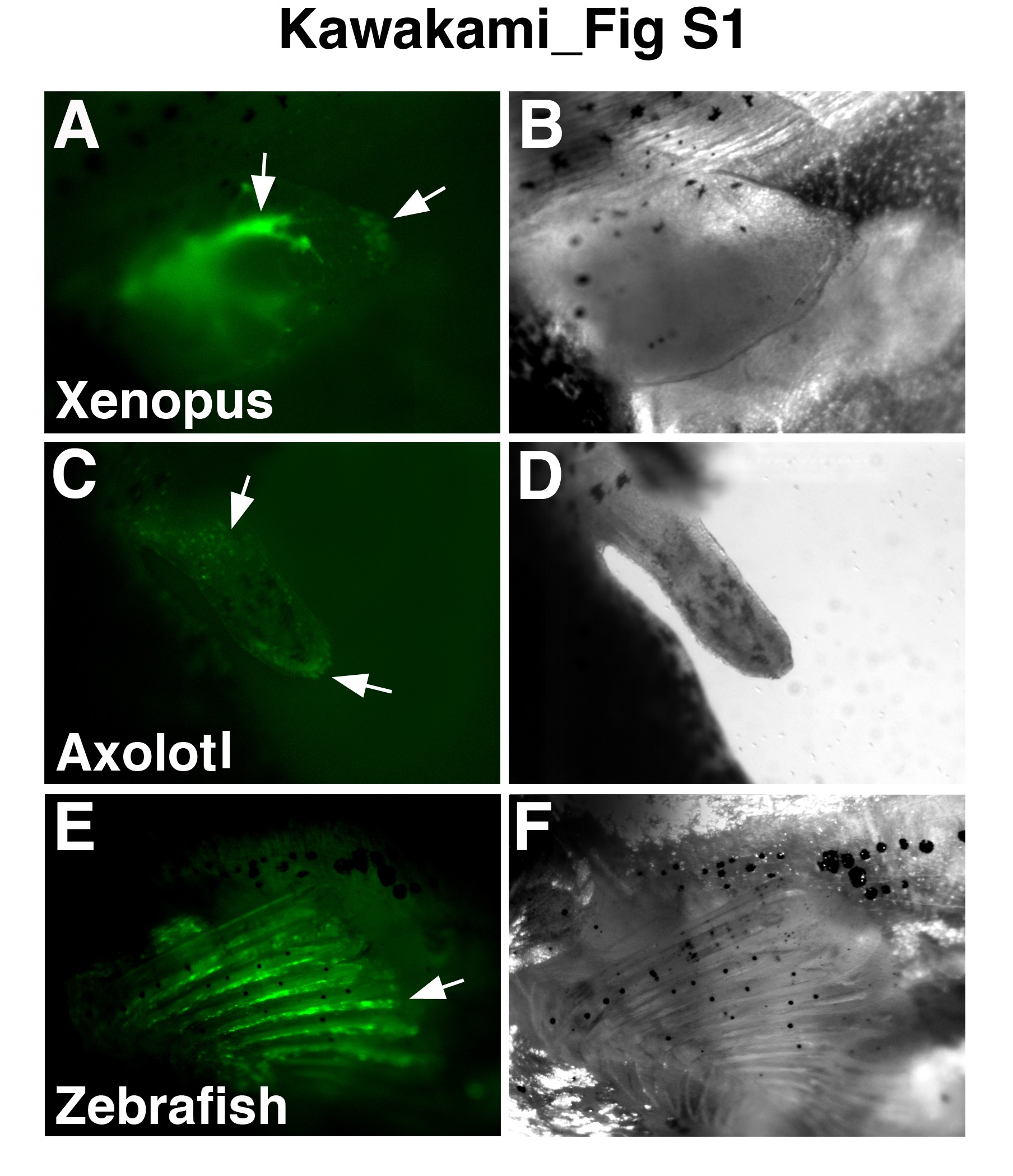 Dark field (A, C, E) and bright field (B, D, F) images of the Xenopus larvae hindlimb (A, B), axolotl larvae forelimb (C, D) and adult zebrafish pectoral fin (E, F). Fluorescent image of a Xenopus hindlimb bud 3 days after amputation and injection of Ad-eGFP at stage 52 (A). Fluorescent image of an axolotl larvae forelimb 1 day after amputation and injection of Ad-eGFP (C). Fluorescent image of an adult zebrafish pectoral fin 1 day after amputation and injection of Ad-eGFP (E). Arrows indicate fluorescent signal by Ad-eGFP.