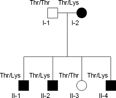 Fig. 1. Family pedigree. Squares indicate males, circles indicate females. Blackened symbols denote individuals with myokymia. Alleles at codon 226 are indicated (Thr = wild-type, Lys = mutation)