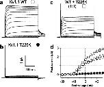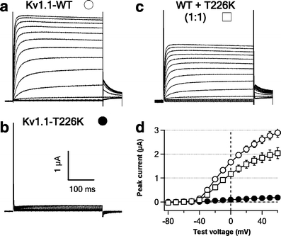 Fig. 3. Missense mutation T226K induces loss of function of human Kv1.1 channels expressed in Xenopus oocytes. a–c Representative family of whole-oocyte currents recorded from oocytes expressing human Kv1.1-WT (a), Kv1.1-T226K (b), and both Kv1.1 WT and T226K (c). Currents were evoked by a series of 350-ms test pulses from −80 to +60 mV in 10-mV increments from a hold potential of −90 mV. Tail currents were recoded at −40 mV. Scale bar, 100 ms and 1 μA. d I–V curves for three experimental conditions in a–c. Data were collected for 10–15 oocytes in each group. The peak currents in a and c are significantly different at test voltages between 0 and +60 mV (P < 0.05)