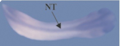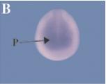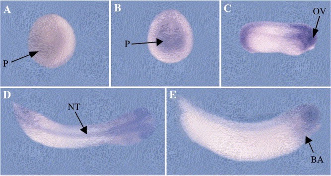 Fig. 1. Expression pattern of the Xenopus retinoblastoma gene. XRb expression was analysed by whole mount in situ hybridisation (stained in purple) in embryos at a range of stages. XRb is expressed in the anterior placodes (P) from stage 16 and increases by stage 19, especially in the optic vesicles (OV). Between stages 26 and 30, strong expression is seen in the optic vesicles, neural tube (NT) and branchial arches (BA). (A) Stage 16, anterior view; (B) stage 19, anterior view; (C) stage 26, lateral view; (D) stage 28, dorsal view; (E) stage 30, lateral view. Anteriors to the right (C, D, E).