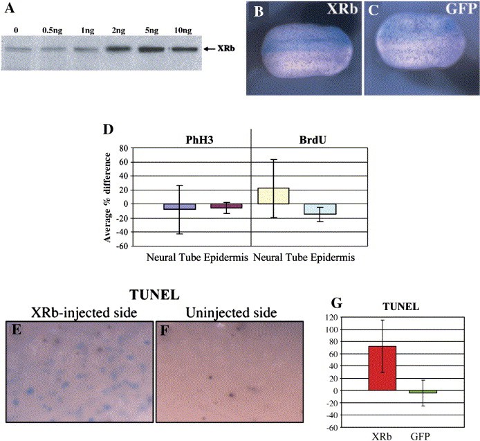 Fig. 4. Overexpression of XRb does not significantly affect the number of cells in mitosis or S phase in the neural tube or epidermis, or the number of apoptotic cells in the epidermis. (A) Embryos were injected in both blastomeres at the two-cell stage with increasing doses of XRb mRNA. Extracts made from stage 19 embryos were Western blotted and probed with an anti-human pRb antibody (XZ160) that cross-reacts with XRb. (B and C) Embryos were injected with 2 ng mRNA encoding XRb or GFP and β-galactosidase (blue) as a marker in one ventral cell at the four-cell stage. At stage 22 epidermal mitotic cells were stained by whole mount immunostaining (purple) with anti-phospho histone H3 antibody. Dorsal views; anteriors to the right; injected sides uppermost. (D) Embryos injected in one dorsal cell at the four-cell stage with 2 ng XRb mRNA and β-galactosidase (blue), with or without BrdU injection at stage 20, were sectioned and immunostained (purple) using anti-phospho histone H3 antibody to visualise mitotic cells or anti-BrdU antibody to visualise cells in S phase. The numbers of positive cells in both injected and uninjected sides of the neural tubes and the epidermis were counted in serial sections: graph shows the average percentage differences between the sides, with error bars showing standard errors (n = 6 embryos for each marker, average of 39 sections per embryo). XRb overexpression causes no significant difference in the number of mitotic cells on the injected side of the neural tube (average 8% decrease; p = 0.3) or in the epidermis (average 6% decrease; p = 0.2), or in the number of cells in S phase in the neural tube (average 22% increase; p = 0.5) or in the epidermis (average 15% decrease; p = 0.1). (E and F) Embryos injected with 2 ng XRb mRNA and β-galactosidase (blue) in one cell at the two-cell stage were fixed at stage 22 and apoptotic cells in the epidermis were visualised using whole mount TUNEL staining (purple). XRb overexpression has no effect on the density of apoptotic cells in the epidermis: XRb-injected side (E) and uninjected side (F) of the same embryo. (G) Apoptotic cells were counted in sample areas of the epidermis on both injected and uninjected sides of whole mount TUNEL-stained embryos. Graph shows the average percentage difference between the numbers of apoptotic cells on the two sides of embryos injected with XRb or GRP mRNA, with error bars showing standard errors. XRb overexpression does not make a significant difference to the number of apoptotic cells in the epidermis (average 72% increase; p = 0.09; n = 8); GFP injection also causes no difference (average 4% decrease; p = 0.28; n = 10).
