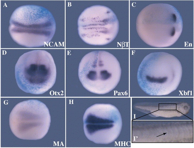 Fig. 5. Overexpression of XRb does not affect neural or muscle differentiation or patterning. Embryos were injected in one blastomere at the two-cell stage with 2 ng XRb mRNA and β-galactosidase as a lineage tracer (blue). (A--H) Expression of a range of markers of neural and muscle differentiation was examined by in situ hybridisation (stained in purple) at stage 15. NCAM (A); neural β-tubulin (B); Engrailed (C); Otx2 (D); Pax6 (E); Xbf1 (F); muscle actin (G); myosin heavy chain (H). The expression patterns of none of these markers were affected by XRb overexpression. Lateral view of an XRb-injected embryo at stage 36 (I) and magnified view of its somites (Iâ²), showing normal somite structure. Arrow indicates normal somite structure (Iâ²). Dorsal views; anterior to the right; injected sides uppermost (A, B, C, G and H). Anterior views; injected sides to the left (D, E and F). Lateral view; anterior to the right (I and Iâ²).
