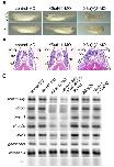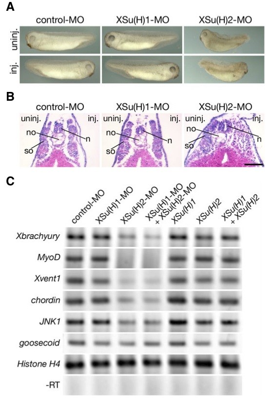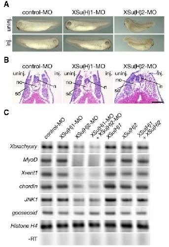 Morphological change of XSu(H)2-depleted embryos. Dwarf embryos were induced by XSu(H)2-MO but not by XSu(H)1-MO. (B) Cross section of XSu(H)2-depleted embryos. Histological analysis shows that embryos injected with XSu(H)2-MO had tissue defects in the somite (so) and notochord (no) without lacking a neural tube (n). Ten ng of each MO was injected into the marginal zone of one blastomere at the 2-cell stage. The injected embryos were fixed at stage 35-36 for histological examination. Scale bar indicates 100 μm. (C) Gene expression in XSu(H)2-depleted embryos. Twenty five ng of XSu(H)1-MO or XSu(H)2-MO was injected into the marginal zone of both blastomeres at the 2-cell stage. The injected embryos were sacrificed at stage 10.5 for quantitative RT-PCR. XSu(H)2-MO reduced Xbrachyury, MyoD, Xvent1, chordin and JNK1 expressions, but had no effect on goosecoid expression in gastrula stage embryos. XSu(H)1-MO, XSu(H)1 XSu(H)2, XSu(H)1 + XSu(H)2 showed no effect on the gene expression of mesodermal markers.