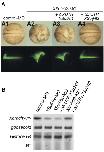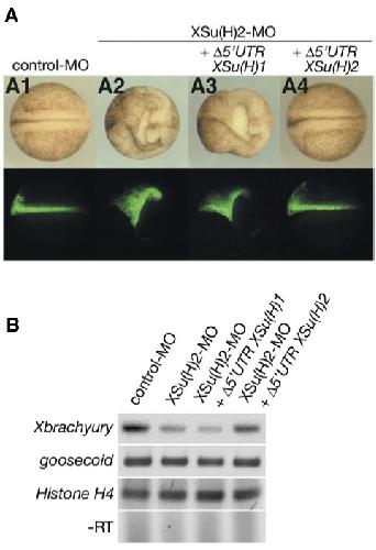 Fig. 4. XSu(H)2 can rescue the defective phenotype caused by XSu(H)2-MO. (A) Embryos were injected with control-MO (25 ng) (A1), XSu(H)2-MO (25 ng) (A2), XSu(H)2-MO (25 ng) + mRNAs of ∆5TR XSu(H)1 (2 ng or 5 ng) (A3) or XSu(H)2-MO (25 ng) + mRNAs of ∆5TR XSu(H)2 (2 ng or 5 ng) (A4) into one dorsal blastomere at the 4-cell stage and morphological phenotype was examined at stage 20. Upper panel shows the dorsal view and lower panel indicates the injected side shown by GFP fluorescence on the same view. (B) Embryos were injected into the marginal zone of both blastomeres at the 2-cell stage and used for the assay of quantitative RT-PCR at stage 11. The defective neurogenesis and the reduction of Xbrachyury expression caused by XSu(H)2-MO were rescued by ∆5TR XSu(H)2 (A4, B), but not by ∆5TR XSu(H)1 (A3, B).