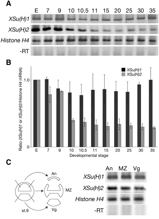 Fig. 1. The temporal expression pattern of XSu(H)1 and XSu(H)2. (A)