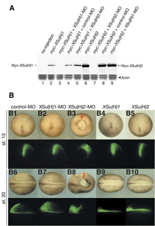 Fig. 2. Effect of XSu(H) morpholinos on early embryonic development. (A) Specificity of morpholino oligonucleotides (MO). Five ng of myc-XSu(H)1 or myc-XSu(H)2 mRNA was injected into the animal pole of each blastomere of 2-cell stage with or without 25 ng of XSu(H)1-MO or XSu(H)2-MO. XSu(H)1 or XSu(H)2 protein was detected by anti-c-myc antibody at stage 10.5. 43 kDa actin bands were used as loading controls (Coomassie stained). (B) Phenotype of the MO-injected embryo. Em- bryos were injected with control-MO (B1, B6), XSu(H)1-MO (B2, B7), XSu(H)2-MO (B3, B8), mRNAs of XSu(H)1 (B4, B9) or XSu(H)2 (B5, B10) into one dorsal blastomere at the 4-cell stage and morphological changes were analyzed at stage 13 (B1-5) or stage 20 (B6-10). To identify the injection side of the embryo, 1 ng of GFP mRNA as the tracer was co- injected with each mRNA or MO. Upper panels (B1-5) show the vegetal view and lower panels (B6-10) show the dorsal view. XSu(H)2-depleted embryos showed delayed gastrulation (arrow in B3) and defective neurogenesis (arrow in B8), while XSu(H)1-depleted embryos developed normally (B2, B7).