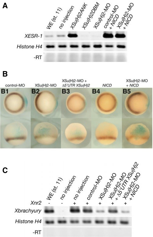 Fig. 5. Xbrachyury expression suppressed by XSu(H)2-MO cannot be rescued by activation of Notch signaling. (A) Embryos were injected with XSu(H)2ANK (2 ng), XSu(H)2DBM (2 ng), XSu(H)2-MO (50 ng), control-MO (50 ng) + NICD (2 ng) or XSu(H)2-MO (50 ng) + NICD (2 ng). Animal cap explants were isolated from the injected embryos at stage 8 and were cultured until stage 11 for RT-PCR. XSu(H)2ANK as an activation construct of Notch signaling increased the gene expression of XESR-1, while XSu(H)2DBM as a dominant-negative form of Notch signaling inhibited it. Even under depleted XSu(H)2 protein, NICD could activate the expression of XESR-1. (B) Embryos were injected with control-MO (B1), XSu(H)2- MO (B2), XSu(H)2-MO + mRNAs of â5TR XSu(H)2 (B3), mRNAs of NICD (B4) or XSu(H)2-MO + mRNAs of NICD (B5) into the marginal zone of one blastomere at the 2-cell stage. The injected embryos were cultured until stage 10.5 and the expression of Xbrachyury was examined using whole- mount in situ hybridization. All embryos were injected with 1 ng of β-galactosidase mRNA as a tracer of the injection side. The injected side was colored blue by staining the activity of β-galactosidase. The expression of Xbrachyury was colored brown. Upper and lower panels show vegetal and lateral views, respectively. Suppression of Xbrachyury gene expression by XSu(H)2-MO occurred widely (B2) and could be rescued by co-injection of â5TR XSu(H)2 (B3); however, activation of Notch signaling by NICD could not rescue the XSu(H)2-MO-induced reduction of Xbrachyury expression (B5). NICD alone did not suppress Xbrachyury expression (B4). (C) Synthesized RNAs of 50 pg Xnr2 were injected into the animal pole of 2-cell stage embryos with 50 ng various MO or 2 ng mRNAs. Animal caps were dissected from the injected embryos at stage 8 and were harvested at stage 11 for RT-PCR analysis. XSu(H)2-MO reduced Xbrachyury expression induced by Xnr2. â5TR XSu(H)2, but not NICD could rescue the XSu(H)2-MO- induced suppression of Xbrachyury gene expression.
