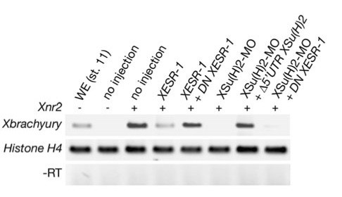 Fig. 6. Xbrachyury expression by XSu(H)2 is independent of regulation by XESR-1. Synthesized RNAs of 50 pg Xnr2 were injected into the animal pole of 2-cell stage embryos together with XESR-1 (1 ng)), XESR- 1 (1 ng) + DN XESR-1 (4 ng), XSu(H)2-MO (50 ng), XSu(H)2-MO (50 ng) + â5TR XSu(H)2 (4 ng), XSu(H)2-MO (50 ng) + DN XESR-1 (4 ng). Animal caps were dissected from the injected embryos at stage 8 and were cultured until stage 11 and then the gene expression of Xbrachyury was examined using quantitative RT-PCR. Overexpression of XESR-1 reduced Xbrachyury induced by Xnr2. This inhibition could be rescued by co- injection with DN XESR-1. The reduction of Xbrachyury expression caused by XSu(H)2-MO could be rescued by co-injection of â5TR XSu(H)2, but not dominant-negative XESR-1, DN XESR-1.