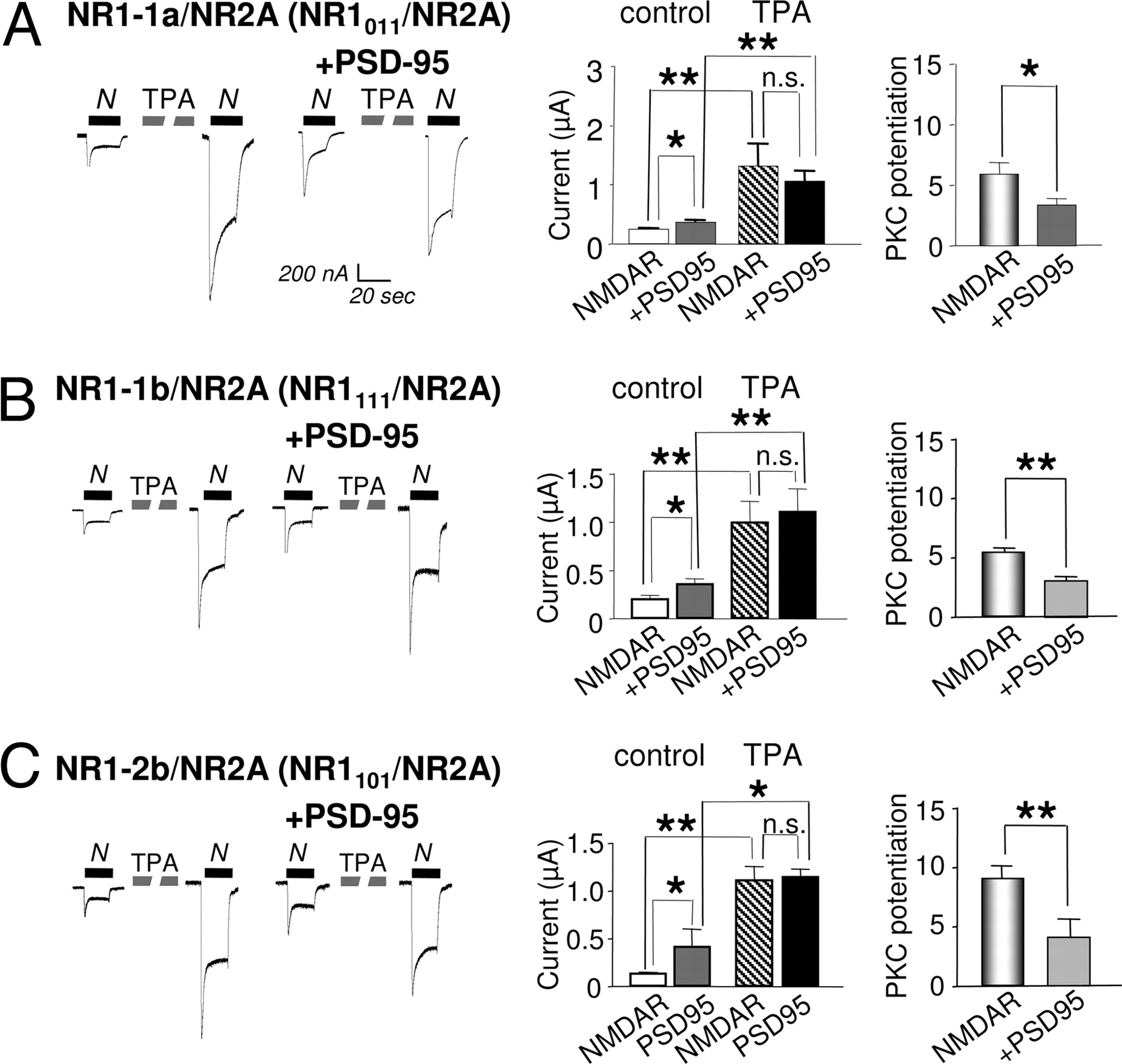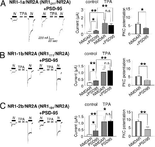 Fig. 5. PSD-95-induced occlusion of PKC potentiation is not regulated by NR1 splicing. (AâC) NMDA-elicited currents recorded from oocytes expressing NR1â1a/NR2A (A), NR1â1b/NR2A (B), or NR1â2b/NR2A (C) receptors alone or together with PSD-95 before and after PKC activation. Responses were elicited by NMDA (300 μM) with glycine (10 μM) and recorded in Ca2+ Ringer's solution at a holding potential of â60 mV. For each splice variant, PKC potentiated NMDA-elicited currents to nearly the same final responses in the absence or presence of PSD-95. Thus, the PKC potentiation ratio was reduced in cells expressing PSD-95.