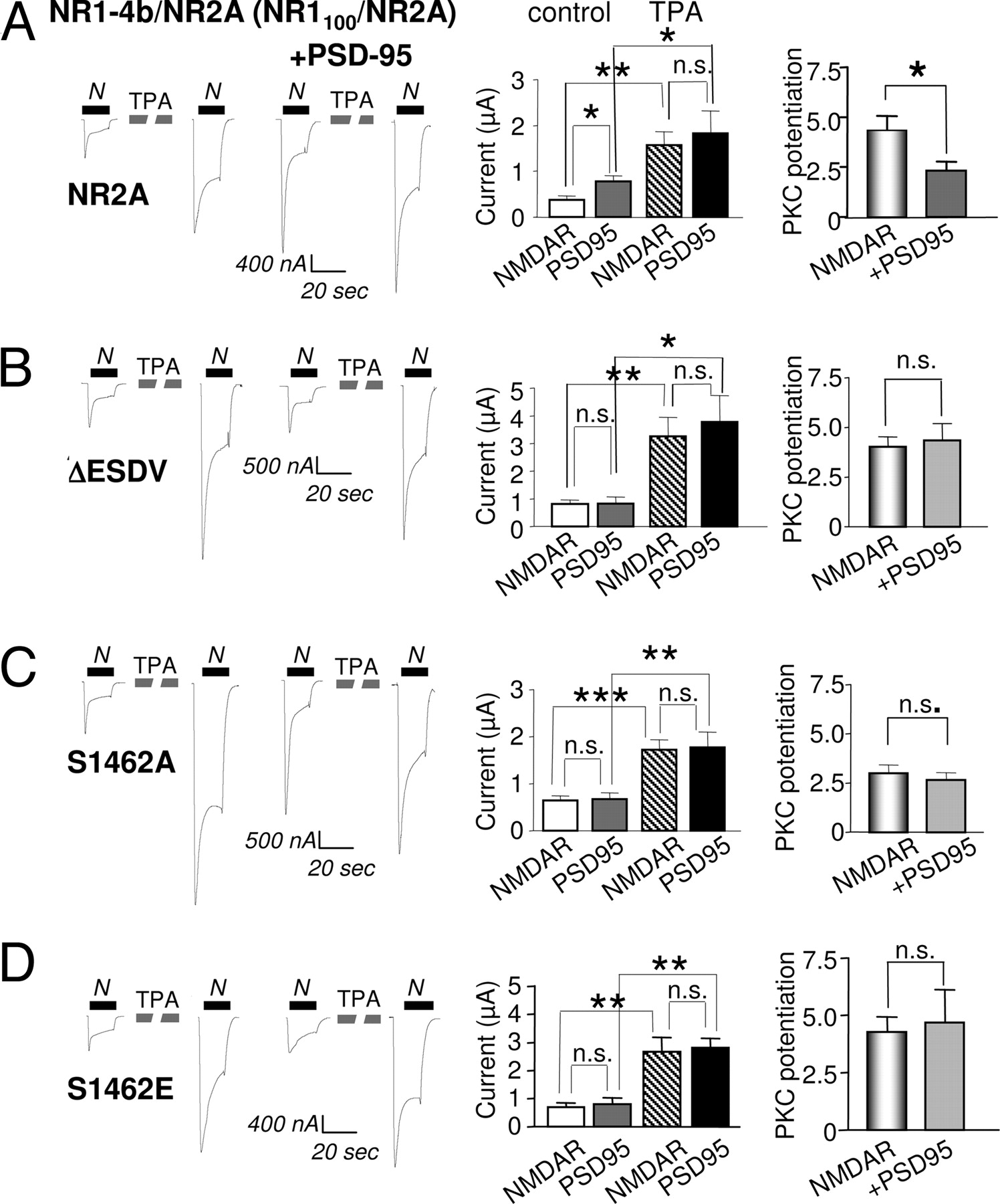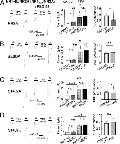 Fig. 6. Ser-1462 in the ESDV PDZ binding motif of NR2A is required for PSD-95 potentiation. The ESDV motif of NR2A was either deleted (NR2A-δESDV) or Ser-1462 was mutated to Ala (NR2A-S1462A) or Glu (NR2A-S1462E). These constructs were coexpressed with NR1â4b, which has the C2â² cassette containing a putative C-terminal PDZ binding motif (tSXV). (AâD) NMDA-elicited currents recorded from oocytes expressing NR1â4b with (A) NR2A wild type, (B) NR2A-δESDV, (C) NR2A-S1462A, or (D) NR2A-S1462E in the absence or presence of PSD-95. Mean values of current and PKC potentiation ratios are shown in the bar graphs to the right. (A) As in Figs. 1â5, coexpression of PSD-95 increased the basal responses but did not affect the final current after PKC potentiation, thus, reducing the PKC potentiation ratio. (BâD) All three mutants prevented the increase in response caused by PSD-95 expression and had no effect on PKC potentiation. See SI Table 2 for detailed values. Methods are as in Fig. 1.