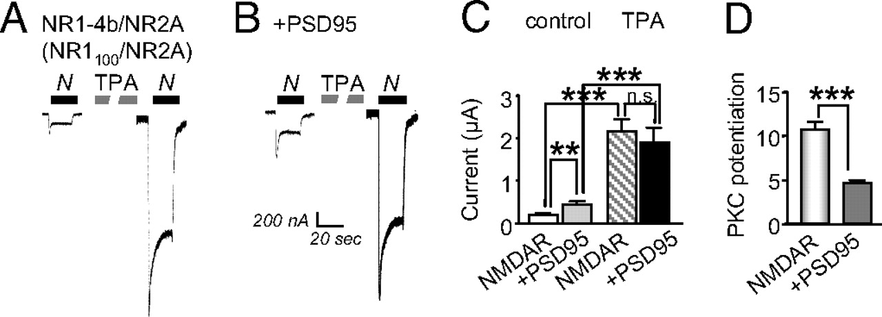 Fig. 1. PSD-95 expression partially occludes PKC potentiation of NMDA-elicited currents. NMDA-elicited currents (100 μM NMDA with 10 μM glycine) were recorded in Ca2+ Ringer's solution at a holding potential of â60 mV from oocytes expressing NR1â4b/NR2A receptors in the absence or presence of PSD-95. (A and B) PKC activated by TPA potentiated NMDA-elicited currents in oocytes expressing NR1/NR2A receptors (Left). Expression of PSD-95 increased the initial or basal NMDA-elicited currents by â2-fold, but PKC potentiated NMDA currents to similar final values in the presence and absence of PSD-95 (Right). (C) Quantitation of these data. (D) Because PSD-95 increased the basal response but not the response after TPA, the potentiation ratio was reduced from â10- to â5-fold. ââ, P < 0.01; âââ, P < 0.001. n.s., not significant.