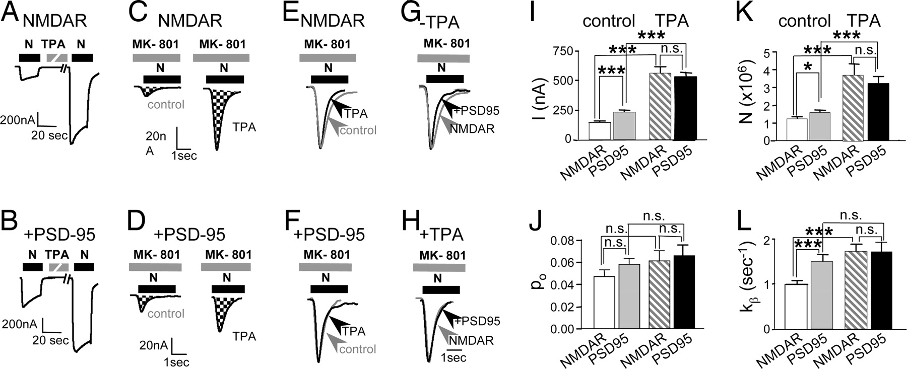 Fig. 3. PSD-95 partially occludes PKC potentiation of NMDA channel number and opening rate. (A and B) Sample records of NMDA-elicited currents recorded from oocytes expressing NR1â4b/NR2A receptors in the absence or presence of PSD-95 and before and after TPA application in Ca2+- free (Ba2+) Ringer's. (C and D) Responses in the absence and presence of PSD-95 in the continuous presence of the open channel blocker MK-801 applied shortly before NMDA (5 μM) to control (Left) and TPA-treated (Right) oocytes. Charge transfer is indicated by cross-hatching. Different oocytes were used for each condition. Coexpression of PSD-95 increased the initial (basal) NMDA-elicited current (compare A with B) and the number of functional NMDA channels, N, at the cell surface under basal conditions (compare C with D). TPA increased N to the same final value in cells expressing NMDARs alone vs. NMDARs with PSD-95, but the potentiation ratio was smaller in cells coexpressing PSD-95 (compare C with D). (EâH), Responses in C and D were normalized to the same peak amplitude for pairwise comparison of the time course of response decay in MK-801, a measure of opening rate, k β. (E) TPA increased the rate of decay of NMDA currents recorded from cells expressing NMDARs in the absence of PSD-95, indicating an increase in the channel opening rate, k β. (F) TPA did not detectably alter k β in cells coexpressing PSD-95. (G) The rate of decay of NMDA currents was greater in the presence than the absence of PSD-95. (H) After TPA treatment, the rate of decay of NMDA currents did not differ in the absence and presence of PSD-95. Increase in k β caused by coexpression of PSD-95 occludes PKC potentiation of k β. (IâL) Summary of data in experiments illustrated in AâH. In the presence of PSD-95, I, N, and k β, but not p o, were greater than in its absence, but the final values after TPA potentiation were not significantly different. Thus, PSD-95 expression occludes the TPA potentiation ratios. Currents were elicited by application of NMDA (1 mM NMDA with 50 μM glycine) at a holding potential of â60 mV.
