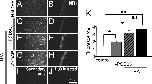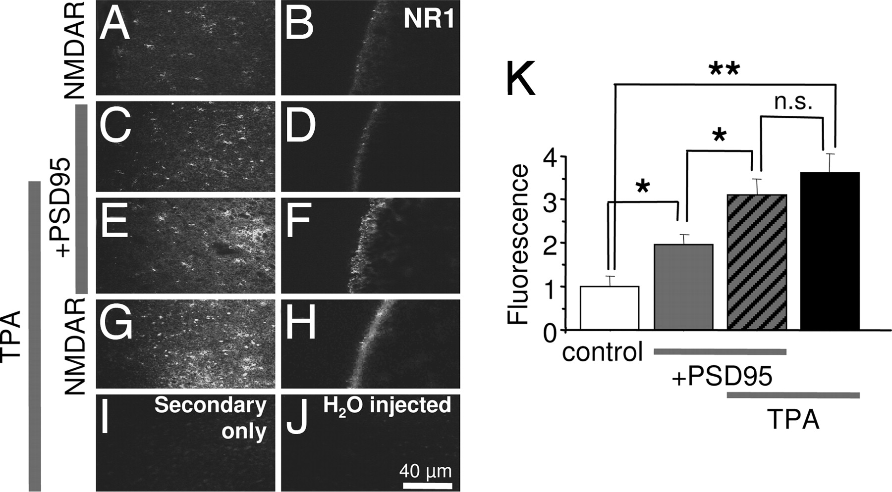 Fig. 4. PSD-95 partially occludes PKC potentiation of surface NMDAR expression. Representative tangential (left column) and cross-sectional (right column) images of oocytes expressing NR1â4b/NR2A receptors in the absence (A and B) or presence (C and D) of PSD-95. (EâH) TPA increased NMDAR surface expression to nearly the same final value in the absence or presence of PSD-95. (I and J) Oocytes expressing NMDARs labeled with secondary antibody in the absence of primary antibody (I) or water-injected oocytes labeled as in A--H (J) showed negligible fluorescence. (K) Summary of data in A--J. â, P < 0.05; ââ, P < 0.01.