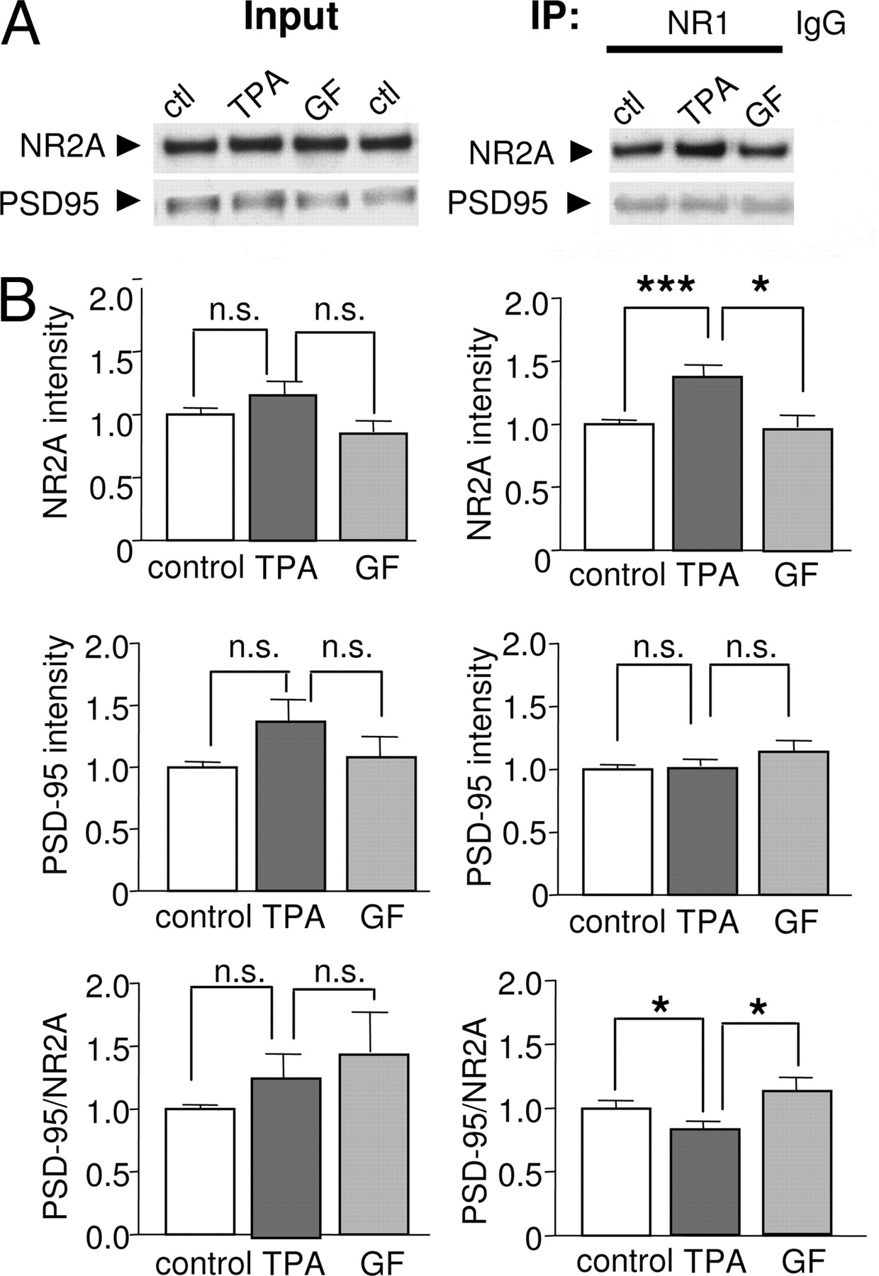 Fig. 7. PKC promotes NR1 and NR2 assembly but not NMDAR/PSD-95 association in neurons. (A) Representative Western blots of Input (Left) and immunoprecipitate (IP, Right) probed with an anti-NR1 antibody. Lysates (protein samples) were prepared from cortical neurons at 9 days in vitro. TPA application did not significantly alter total NR2A or PSD-95 protein abundance. TPA increased the abundance of NR2A, but not of PSD-95, that coimmunoprecipitated with an anti-NR1 antibody. TPA effects were blocked by the highly specific PKC blocker GF109203X (GF). (B) Summary of data.