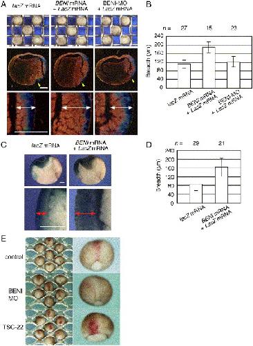 Fig. 4. Gastrulation defect caused by BENI mRNA. (A) lacZ mRNA (400 pg), BENI mRNA (1 ng) and lacZ mRNA, or BENI-MO (4 pmol = 34 ng) and lacZ mRNA were injected into both dorsoanimal blastomeres of 4-cell embryos. Vegetal view of embryos at stage 10 (top panels). There was no discernible delaying of gastrulation. Embryos were histologically examined and observed under diffuse light (middle panels). High magnification view of dorsal involuting marginal zone (IMZ) of the middle panels (bottom panels). Double-headed arrow indicates width of dorsal IMZ. Yellow arrowheads indicate the dorsal lip. Scale bar, 200 μm. (B) Width of dorsal IMZ was measured. (C) lacZ mRNA or BENI mRNA and lacZ mRNA was injected into both ventroanimal blastomeres of 4-cell embryos. Embryos were bisected at stage 10 (top panels). Highly magnified ventralIMZ of top panels (bottom panels). Double-headed arrow indicates width of ventralIMZ. Scale bar, 200 μm. (D) Width of ventralIMZ was measured. (E) lacZ mRNA (control, upper column), lacZ mRNA and BENI MO (middle column), and lacZ mRNA and TSC-22 mRNA (lower column) were injected into dorsoanimal blastomeres of 4-cell embryos. At stage 13, embryos were stained with Red-gal and the staining pattern observed.