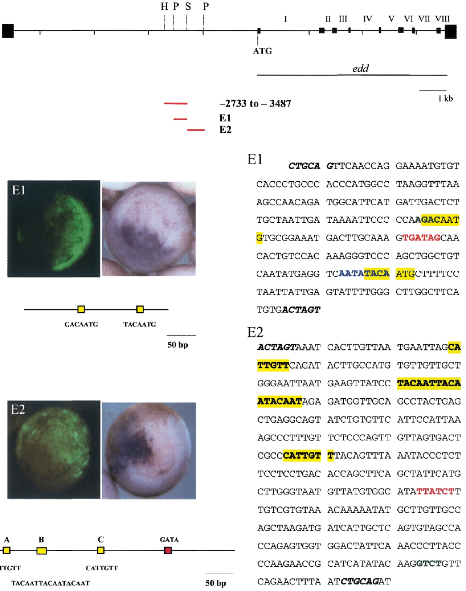 of E and E2, indicating Sox-binding sites (yellow boxes, contained