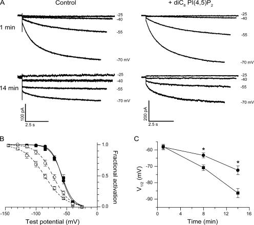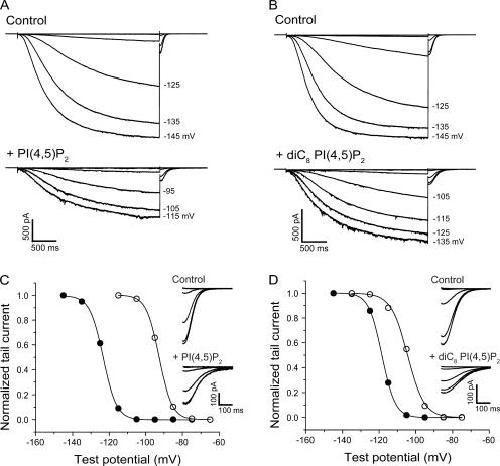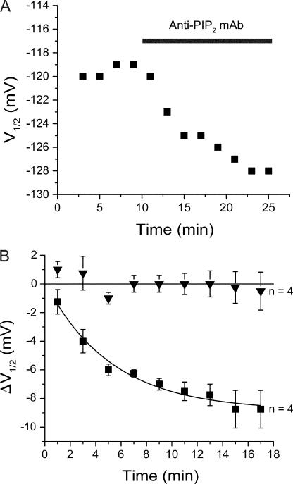 Figure 7. Reducing endogenous PI(4,5)P2 levels shifts HCN2 activation to more negative voltages. (A) Time course of V1/2 in a single inside-out patch experiment in response to bath application of 30.3 μg/ml of anti-PI(4,5)P2 antibody. (B) Time course of average V1/2 shifts after bath application of anti-PI(4,5)P2 antibody (squares) or heat-inactivated antibody (inverted triangles). |