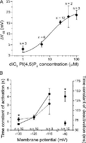 Figure 2. Action of diC8 PI(4,5)P2 on the gating of HCN2. (A) Dose–response curve for shift in V1/2 (ΔV1/2) as a function of concentration of diC8 PI(4,5)P2. Data fit with the Hill equation. (B) Time constants (τ) of HCN2 current activation (left) and deactivation (right) in absence (squares, solid line) and presence (circles, dashed line) of 25 μM diC8 PI(4,5)P2. The difference between the time constants of activation at −135 mV before (0.731 ± 0.079 s) and after (1.28 ± 0.22 s) diC8 PI(4,5)P2 application were statistically significant (*, P < 0.02, t test). The difference between the time constants of deactivation at −40 mV before (67.6 ± 5.0 ms) and after (136 ± 13 ms) diC8 PI(4,5)P2 application were also statistically significant (*, P < 0.001, t test). |