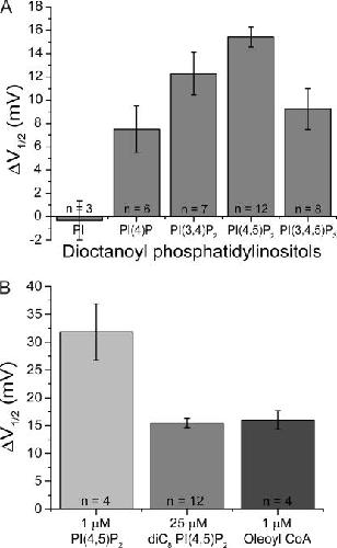 Figure 3. Shift in V1/2 of HCN2 depends on number and location of inositol phosphates and on acyl chain length. (A) V1/2 shifts with 10-min applications of dioctanoyl phosphatidylinositol (PI) (−0.3 ± 1.7 mV, n = 3), dioctanoyl phosphatidylinositol 4-phosphate (PI(4)P) (+7.5 ± 2.0 mV, n = 6), dioctanoyl phosphatidylinositol 3,4-bisphosphate (PI(3,4)P2) (+12.3 ± 1.8 mV, n = 7), dioctanoyl phosphatidylinositol 4,5-bisphosphate (PI(4,5)P2), and dioctanoyl phosphatidylinositol 3,4,5-trisphosphate (PI(3,4,5)P3) (+9.3 ± 1.8 mV, n = 8). Differences between the responses to diC8 PI(4,5)P2 and diC8 PI(3,4,5)P3 and between the responses to diC8 PI(4,5)P2 and diC8 PI(4)P are statistically significant (P < 0.05; ANOVA, Post Hoc). (B) V1/2 shifts after 28-min application of 1 μM of native PI(4,5)P2 (+31.8 ± 5.1 mV, n = 4), 10-min application of 25 μM diC8 PI(4,5)P2 (+15.4 ± 0.8 mV, n = 12), and 2-min application of 1 μM oleoyl coA (+16.0 ± 1.7 mV, n = 4). |