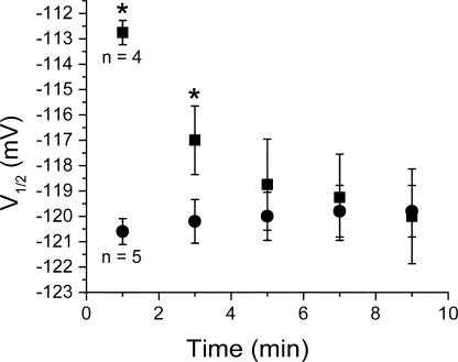Figure 5. Phosphatase inhibitors delay the rundown in V1/2. V1/2 values were assessed after inside-out patches were excised into normal bath solution (circles) or FV bath solution to inhibit phosphatase activity (squares). The differences in respective V1/2 values measured 1 and 3 min after patch excision were statistically significant (*, P < 0.05, t test). |