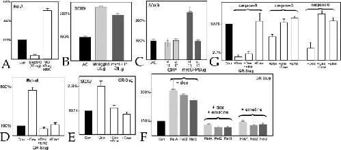 Figure 8. Slug's regulatory targets:A: In animal caps analyzed at stage 11, the Slug MO (10 ng/embryo) produced a decrease in RelA RNA levels that was rescued by co-injection of mycGFP-Slug RNA (1 ng/embryo). B: Animal caps were prepared from embryos injected with either untagged or mycGFP-Slug RNAs; both produced a similar increase in Sox9 RNA levels. C: Animal caps, from embryos injected with either mt-GFP or mycGFP-Slug RNAs, were analyzed when control embryos reached stage 11 or stage 16; at stage 11 mycGFP-Slug induced an increase in Sox9 RNA levels, which returned to baseline by stage 16. No change in Sox9 RNA levels were observed at either stage in animal caps expressing mt-GFP. In GR-Slug injected caps, levels of Bcl-xL (D), Sox9 (E), RelA, Rel2 and Rel3 (F), and caspase-9, -3 and -6 (G) RNAs were increased in response to dexamethasone; with the sole exception of caspase-9, these increases were blocked by emetine. In all panels, error bars reflect standard deviation from the mean of multiple experiments. |