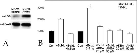 Figure 4. Characterization of Bcl-xL effects on NF-κB activity.A: Fertilized eggs were injected with RNA (650 pg/embryo) encoding Xenopus IκBα-V5. Beginning at stage 8, experimental embryos were treated with 50 µM AKBA and analyzed at stage 11 by SDS-PAGE/immunoblot using an anti-V5 antibody and the antiSOX3c antibody to visualize endogenous Sox3 protein as a loading control. AKBA treatment stabilized the IκBα-V5 polypeptide. B: Fertilized eggs were injected with p3XκB-firefly luciferase (“3κB-Luc”) and pTK-Renilla luciferase (“RL-TK”) DNAs (10 pg/embryo each) either alone (“Con”) or together with Bcl-xL (500 pg/embryo) RNA, or Bcl-xL and IκBsa (600 pg/embryo) RNAs. Alternatively, animal caps prepared from Bcl-xL RNA injected embryos were cultured in either control buffer (0.1% DMSO), 20 µM or 50 µM AKBA. At stage 11, caps were analyzed for luciferase activity. Bcl-xL induced an increase in 3XκB-Luc activity that was blocked by either IκBsa or AKBA. Error bars in B reflect standard deviation from the mean of multiple experiments. |