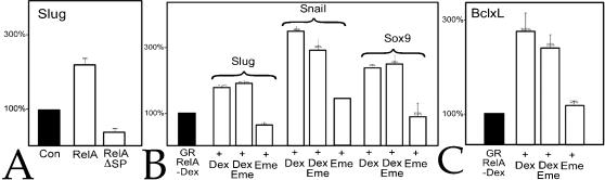 Figure 7. NF-κB's regulatory targets:A: In animal caps, RelA lead to an increase in Slug RNA levels, while RelAΔSP produced a decrease. When activated by dexamethasone (+Dex), the hormone-regulated form of RelA, GR-RelA (600 pg RNA/embryo), induced a similar increase in the levels of Slug RNA, as well as Snail, Sox9 (B), and Bcl-xL (C) RNAs compared to animal caps from GR-RelA injected embryos not exposed to dexamethasone. Similar effects were seen in the presence of emetine (+Dex+Eme,), while emetine alone (+Eme) had little effect on any of measured RNA levels. Error bars in reflect standard deviation from the mean of multiple experiments. |