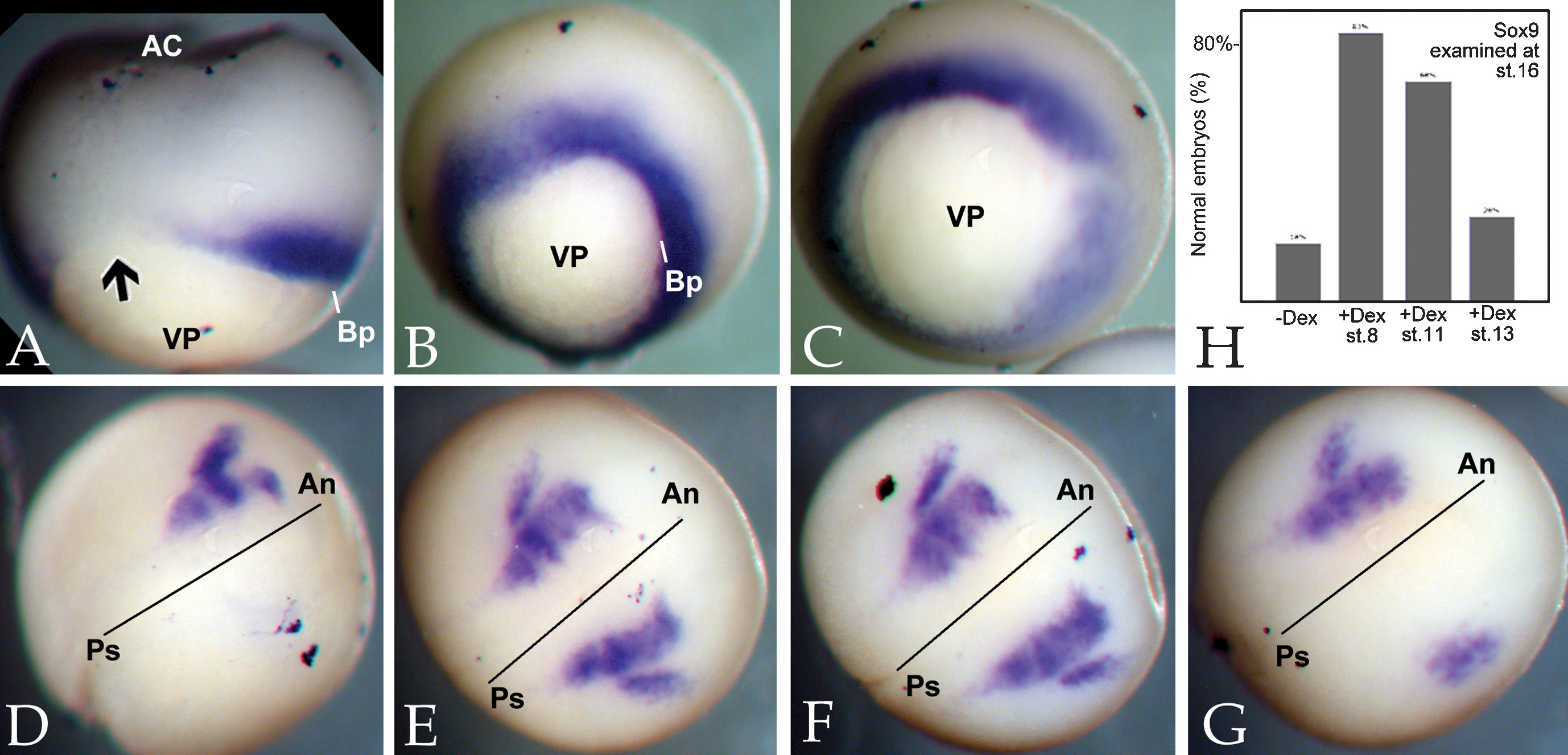 Figure 2. Timing of Slug rescue of Slug MO phenotypes:To analyze the timing of Slug activity in the early embryo, we injected one cell of two cell embryos with Slug MO (10 ng/embryo) together with RNA (650 pg/embryo) encoding the chimeric GR-Slug-GFP protein. A: In the absence of the activating drug dexamethasone, the Slug MO phenotype, i.e. suppression of Xbra expression in stage 11 embryos (A)(arrow) and suppression of Sox9 expression in stage 16 embryos (D), was unaltered. When embryos were treated with dexamethasone (20 µM) beginning at stage 8, there as an essentially complete rescue of Xbra (B,C) and Sox9 expression (E,H). Treatment of embryos with dexamethasone at stage 11 (early gastrulation) was also effective at rescuing Sox9 expression (F,H), while addition of dexamethasone at stage 13 (late gastrulation/early neurulation) produced at most a partial and inefficient rescue of Sox9 expression (G,H). |