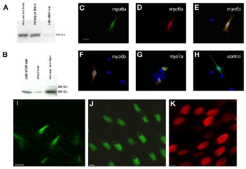 antibody binds zebrafish myo7a. (H) NIH3T3 cell transfected with myo6b but not labeled with