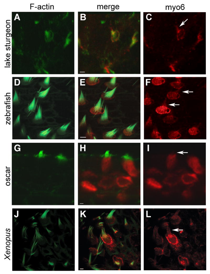 zebrafish, (GâI) oscar, (JâL) Xenopus. Arrows in C, F, I, and L indicate hair bundles that are