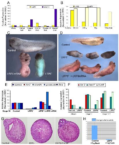 Fig. 1. LRP6 is necessary for dorsal axis formation. (A) Two wild-type whole oocytes, and four animal and vegetal halves, or six animal, equatorial and vegetal thirds, were frozen and assayed by real-time RT-PCR for the expression of LRP6 and Wnt11 mRNAs. LRP6 mRNA was expressed throughout the oocytes. (B) Groups of two control and LRP6 antisense oligo-injected oocytes (2.5, 5 and 10 ng oligo) were incubated for 24 hours, and assayed for the expression of LRP6 and the related LRP5 mRNA. LRP6, but not LRP5, mRNA levels were reduced by the antisense oligo. (C) The phenotype of tailbud-stage embryos derived from oocytes injected with 500 pg mouse LRP6 mRNA (dorsalized) or 5 ng LRP6 antisense oligo (LRP6-; ventralized). (D) The LRP6-depleted ventralized phenotype at tailbud stage caused by the injection of LRP6 antisense oligo (middle row; 3 ng antisense oligo injected) was rescued by the injection of 100 pg mouse LRP6 mRNA (bottom row). LRP6 mRNA was injected 48 hours after oligo injection and 24 hours before oocyte maturation. (E) The expression of Wnt target genes (siamois, Xnr3, chordin and goosecoid) assayed by real-time RT-PCR at the early gastrula stage in sibling embryos to those in D. (F) The expression of endoderm marker Xsox17α and ventral mesodermal marker Xwnt8 was delayed in LRP6-depleted embryos at the late blastula stage, but reached wild-type levels of expression by the early gastrula stage in LRP6-depleted embryos. By comparison, Xnr3 expression remained off in LRP6-depleted embryos. (G) Transverse sections of tailbud-stage embryos derived from a control, LRP6-depleted and LRP6- + LRP6-mRNA-injected oocytes. LRP6 depletion resulted in a lack of dorsal structures, which was rescued by LRP6-mRNA injection. (H) TOPflash reporter activation in control and LRP6-depleted late blastulae after injection into two dorsal cells at the 4-cell stage. Error bars indicate the standard deviation from the mean (s.e.m.).