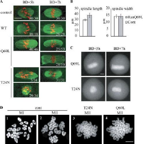 Figure 5. MI spindle defects induced by excess or reduced levels of RanGTP do not compromise homologous chromosome segregation. (A and B) RanQ69L-injected oocytes assemble longer spindles with poles defects, whereas RanT24N induces a lack of MT assembly associated with a delay in spindle formation. (A) Immature oocytes were microinjected with RanWT, RanQ69, or RanT24N, collected 5 or 7 h after GVBD and immunostained for MTs (green) and DNA (red). Oocytes were analyzed by confocal microscopy, and all confocal sections were projected. Proportions of each phenotype are indicated in the bottom right corner. (B) Statistics of spindle length and width in control and RanQ69L-injected oocytes. Error bars indicate SD. (C) Still images taken from time-lapse microscopy of tubulin-GFP (Tub-GFP) of oocytes injected with tubulin-GFP together with RanQ69L or RanT24N RNA. (D) Meiosis I spindles assembled with modified RanGTP levels can segregate homologous chromosomes. Noninjected control oocytes were collected 6 h (MI) or 12 h (MII) after GVBD and submitted to chromosome spread preparation. MI preparation shows only bivalent chromosomes with chiasmata, whereas MII preparation shows only univalent chromosomes (1 and 2). RanT24N- or RanQ69L-injected oocytes were collected 12 h after GVBD (MII) and similarly submitted to chromosome spread preparation (3 and 4). In both cases, only univalent chromosomes are seen. 25 oocytes were analyzed for each condition. Bars, 10 μm.