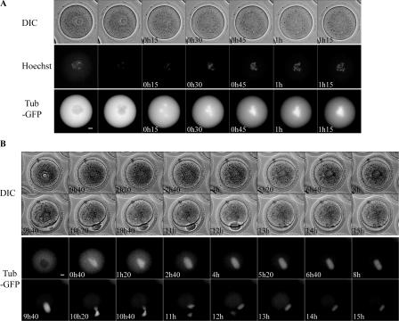 Figure 1. Spindle formation during mouse meiotic maturation. (A) Time-lapse microscopy of phase contrast (DIC), Hoechst-stained chromosomes (Hoechst), and tubulin-GFP RNA-injected (Tub-GFP) oocytes. Images were taken every 15 min. (B) Time-lapse microscopy of phase contrast (DIC) and tubulin-GFP RNA-injected (Tub-GFP) oocytes. Images were taken every 20 min. Times after GVBD are indicated in the bottom left corner. n = 33. Bars, 10 μm.