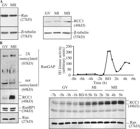 Figure 2. Characterization of Ran and its regulators in mouse and X. laevis oocytes. (A, left) The amount of Ran protein is stable during meiotic maturation of mouse oocytes. 30 immature (GV) or mature (MII) mouse oocytes were collected and immunoblotted using a monoclonal anti- Ran antibody and an anti-tubulin antibody. (right) The amount of RCC1 increases slightly during meiotic maturation of mouse oocytes. 100 immature (GV), 4 h after GVBD (MI), or mature (MII) mouse oocytes were collected and immunoblotted using a polyclonal anti-RCC1 antibody and an anti-tubulin antibody. (B, left) RCC1 levels increase during meiosis in X. laevis oocytes, but RanGAP, RanBP1, and Ran levels remain constant. Oocyte lysates (GV) or egg lysates (MII) were immunoblotted using anti-RanGAP, anti-RCC1, anti-RanBP1, and anti-Ran antibodies. (top right) Histone H1 kinase activity (arbitrary units) during meiotic maturation induced by progesterone. (bottom right) Increase of RCC1 amount during meiosis resumption in X. laevis. Two oocytes were used for each time point.