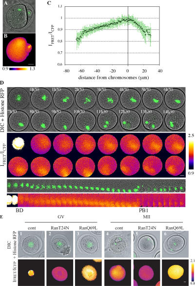 Figure 3. Detection of a gradient of RanGTP-induced release of importin β in live mouse oocytes. (A and B) Live MII-arrested mouse oocyte injected with Rango and histone-RFP encoding RNA. (A) Image of phase contrast (DIC) merged with the image of the chromosomes (in green). (B) Pseudocolored IFRET/ICFP ratio of the same oocyte expressing Rango. (C) IFRET/ICFP ratio line scans performed perpendicularly to the metaphase plate from 10 MII oocytes, where the position of the chromosomes was arbitrarily set at 0. (D) Time-lapse microscopy of mouse oocytes injected with histone-RFP and Rango encoding RNA. The top panel corresponds to the phase contrast (DIC) merged with the image of the chromosomes (in green). The bottom panel corresponds to the pseudocolored IFRET/ICFP ratio emitted by the Rango probe. Time after GVBD is indicated in the top left corner on the DIC time-lapse image. The two bottom panels correspond to the kymograph of a cropped region containing the chromosomes from the same time lapse (one image per 30 min) plotted against time. n = 27. BD, GVBD; PB1, first polar body extrusion. (E) The gradient of RanGTP-regulated release of importin β is perturbed by RanT24N or RanQ69L throughout meiotic maturation. Immature (GV; 1, 2, and 3) or metaphase II–arrested (MII; 4, 5, and 6) mouse oocytes injected with Rango and histone-RFP encoding RNA alone (1 and 4; n = 30) or further injected either with RanT24N (2 and 5; n = 41 for GV and 37 for MII) or RanQ69L (3 and 6; n = 43 for GV and 36 for MII). (top) Image of phase contrast (DIC) merged with the image of the chromosomes (in green); (bottom) pseudocolored IFRET/ICFP ratio of the corresponding oocyte expressing Rango. The same scale of colors was applied to all samples. Bars, 20 μm.