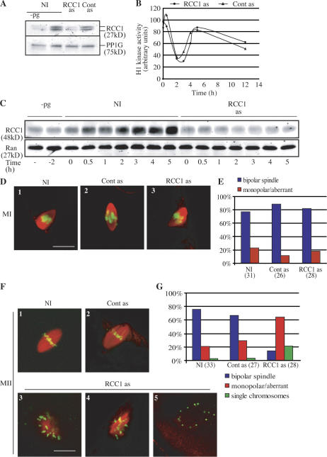 Figure 7. Down-regulation of RCC1 during meiotic maturation in X. laevis oocytes does not compromise meiosis I spindle formation but affects the meiosis II spindle. (A) Western blot on oocyte lysates using antibodies against RCC1 or PP1G as loading control, before (−pg) and 12 h after induction of maturation with progesterone in nontreated (NI), control injected (Cont as), or RCC1 knockdown (RCC1 as) samples. (B) Histone H1 kinase activities were measured with time after GVBD in control injected (triangles) and RCC1 knockdown (circles) oocytes. (C) Western blot on oocyte lysates using antibodies against RCC1 and Ran as loading control, before and after induction of maturation with progesterone in nontreated controls or antisense RCC1-injected oocytes. Samples were taken before progesterone addition or after GVBD (GVBD corresponds to time 0). (D–G) Representative images (D and F) and quantitative analysis of imaged structures (E and G) of spindles visualized in MI (D and E; 1.5 h after GVBD) or MII (F and G; 12 h after GVBD) by indirect immunofluorescence with antibodies against α-tubulin (red) or Cytox green (green) of oocytes treated as in (A, B, and C). Bars, 20 μm.