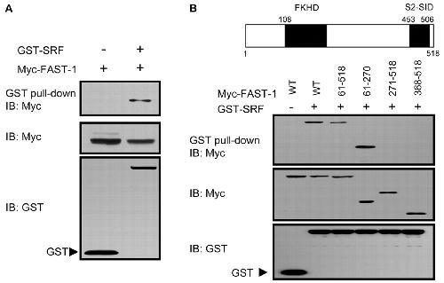 SRF binds FAST-1. (A) GST-tagged SRF was transfected into 293T cells together with Myc-FAST-1. Cell lysates were pulled down by glutathione-agarose beads and then immunoblotted with anti-Myc antibody. (B) Schematic representation of the structure of FAST-1. FKHD, Forkhead DNA-binding domain. Myc-tagged FAST-1 deletion mutants were transfected into 293T cells together with GST-SRF. Cell lysates were pulled down by glutathione-agarose beads and then immunoblotted with anti-Myc antibody. |