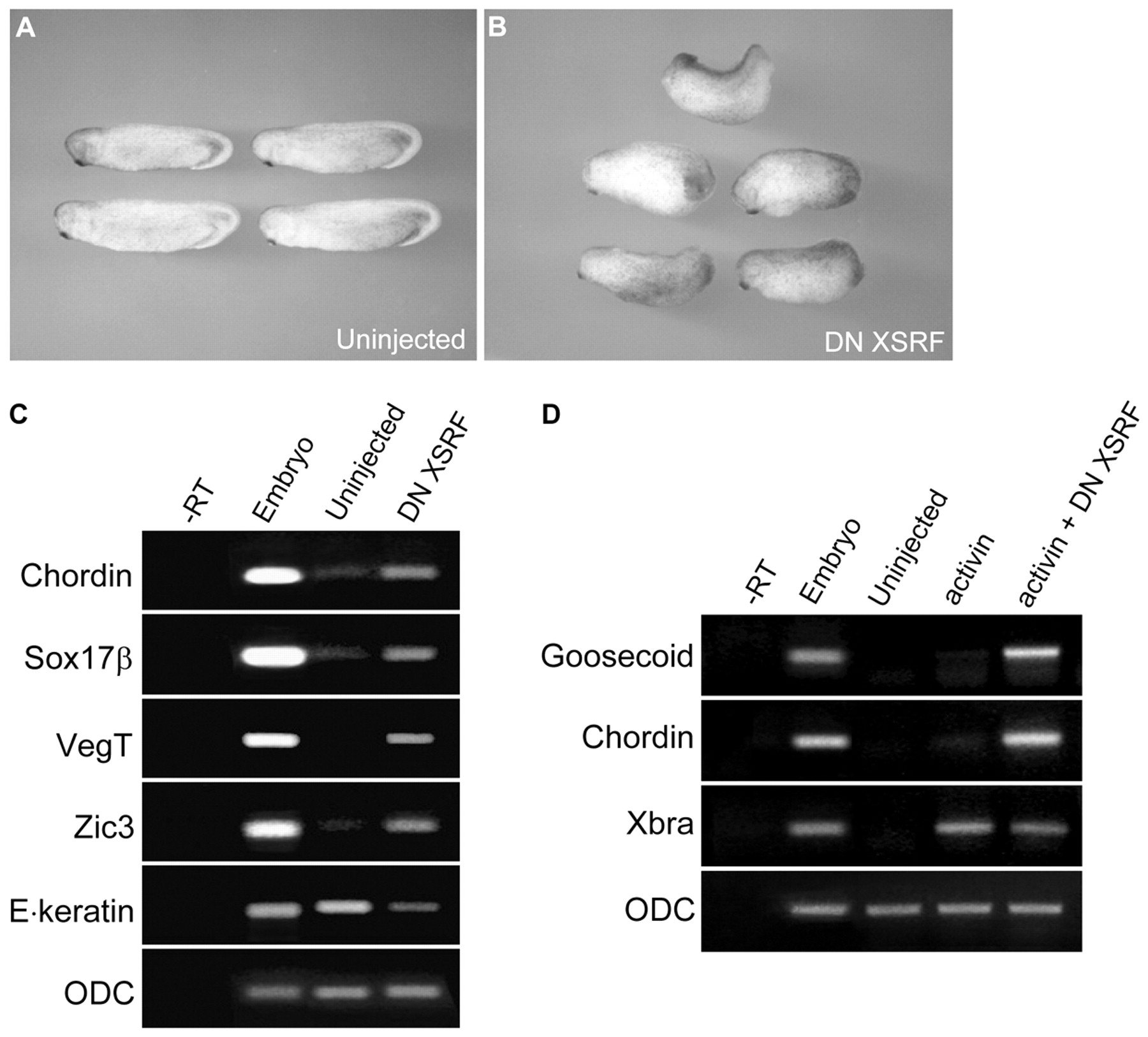 Interfering with XSRF function changes cell fates. (A,B) Phenotypes of embryos injected with DN XSRF RNA dorsally as compared with uninjected embryos. (C,D) Embryos were injected at the four-cell stage in the animal pole region with DN XSRF mRNA (1-2 ng) and the animal cap explants cut at stage 8.5 were cultured to stage 10.25 in the presence or absence of Activin protein (5 ng/ml) and then analyzed by RT-PCR. (C) DN XSRF alone induced mesoderm (Chordin and VegT), endoderm (Sox17β) and neural (Zic3) markers in animal caps. Epidermal keratin (EÃkeratin), an epidermal marker, was reduced by injection of DN XSRF. (D) DN XSRF enhanced the ability of Activin to induce target genes in animal caps. ODC was used as a loading control; Uninjected, uninjected control animal caps. |