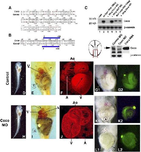 Depletion of Coco protein randomizes the left right axis. (A) Alignment of the Coco and Coco2 sequences. (B) Design of Coco MO1 and 2. A mix of both was used. (C) Coco MO specifically inhibits translation of injected and endogenous wild-type Coco RNA but not of a 5Ⲡmutated RNA (Mut Coco). Western blots. Upper panel. 100 pg Coco or Mut Coco RNA were injected in the animal pole of each blastomere at the two-cell stage, alone (lanes 2, 5) or with 20 ng of either Coco MO (lanes 3, 6) or Coco Mut MO (lane 4). Animal caps were collected at stage 10. Coco protein was detected with anti-Coco antibody (1:10,000). Lower panel. Expression of endogenous Coco protein is inhibited by Coco MOs. The diagram represents a neurula-stage embryos, dorsal view, with the dissected dorsal posterior fragment boxed. Each lane contains 100 dissected dorsal posterior fragments (stage 18) from embryos injected dorsally with 3 ng control MO or 3 ng Coco MO. Positive control was overexpressed Coco FLAG RNA. Polyclonal antibodies for Coco (1:500) and β-catenin (1:10,000) were used. (D) Stage 46 embryos, dorsal (whole, D, H) and ventral (details) views. (D) Control embryos. (H) Embryos injected at four-cell stage in the dorsal right blastomere with 3 ng Coco MO. (E, I) Immunohistochemistry (peroxidase), (F, J) immunofluorescence for cardiac troponin. V: ventricle; A: atrium; Ao: aorta. Curved arrows indicate the direction of the outflow tract and of the gut looping, straight arrows in panels F and J indicate the antero-posterior axis. Panel I is a complete inversion (Situs inversus), panel K is an isolated gut inversion and panel L is an isolated heart inversion (Situs ambiguus). Hearts are contoured in panels G1, K1 and L1, and G2, K2, and L2 show the position of the gall bladder by UV autofluorescence in the same embryos. |