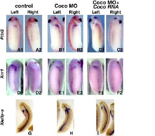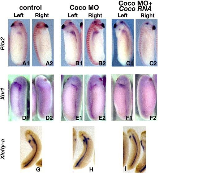 The effect of Coco MO on asymmetrically expressed genes. Stage 256 embryos were stained by in situ hybridization for Pitx2c (A), Xnr1 (D), and Xlefty-a (G). Left and right sides of the same embryos are shown. Panels G are dorsal views of cleared embryos, showing midline expression of Xlefty-a. Embryos injected in the right dorsal blastomere with 3 ng Coco MO have mostly bilateral expression of Pitx2c (B), Xnr1 (E), and Xlefty-a (H). Coinjection of Mut Coco RNA (10 pg) restores left-side expression in Coco MO-injected embryos (Pitx2c C, Xnr1 F, Xlefty-a I). Panels A, D, G are controls. Embryos in panels A were coinjected with 1 ng LacZ RNA and stained with Red Gal, to show that the right side was correctly targeted.