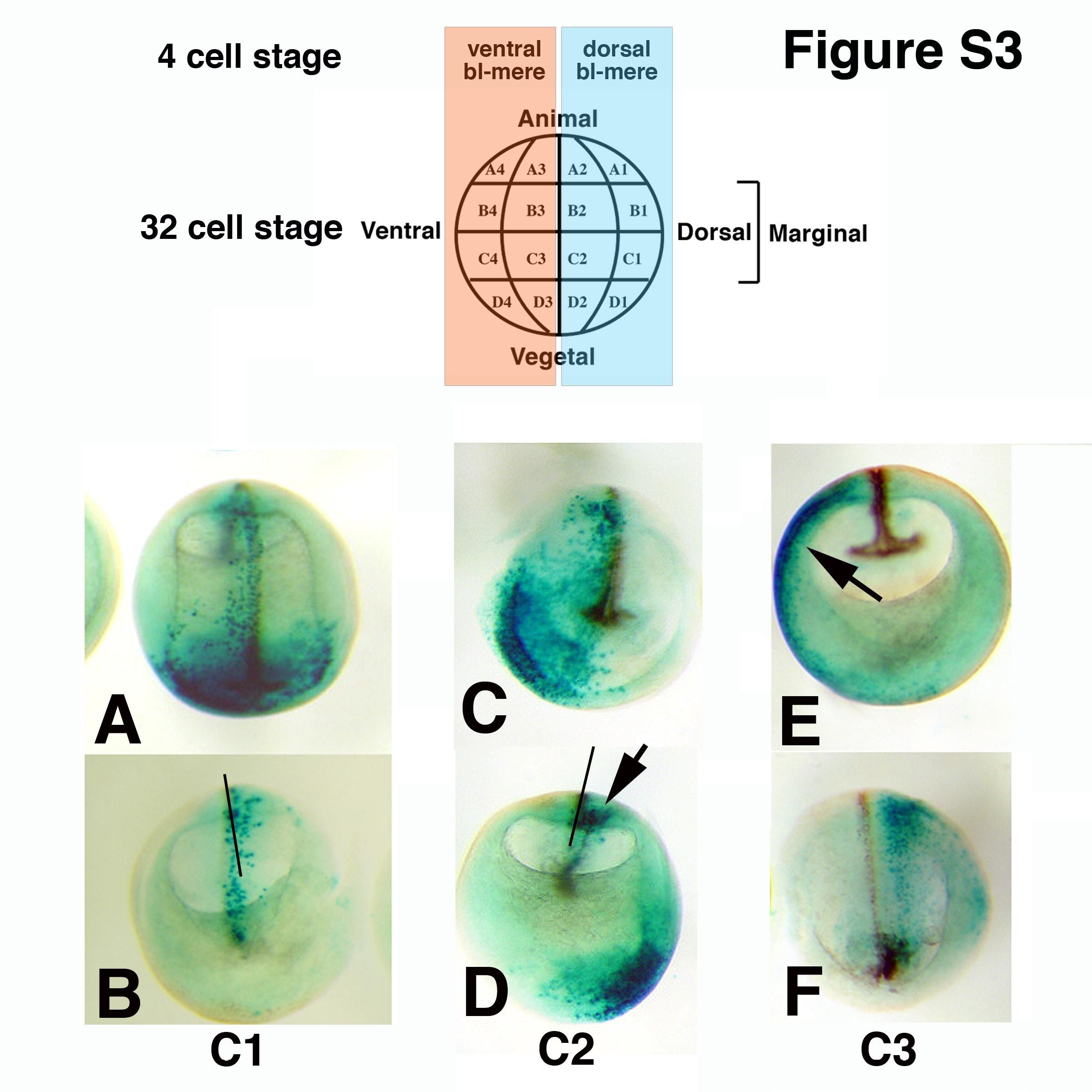 Supplementary Fig. S3. Cell fate of tier C blastomeres from 32 cell stage embryos, at stage 18. 32 cell stage embryos (upper panel, nomenclature of Nakamura, descendents of the dorsal blastomere from 4 cell stage in light blue, and of the ventral blastomere in pink) were injected in blastomeres C1, C2 (dorsal descendents) and C3 (ventral descendent) with 2 ng LacZ RNA, collected at stage 18, and stained with X-Gal (blue dots). All embryos are cleared. A, B. C1 injection. A: dorsal view. B: sectioned posterior half, internal view. Most of the tracer migrates to the anterior pole, the rest is mostly axial, with some contribution to posterior paraxial mesoderm. C, D. C2 injection. C: anterior half, external view. D: posterior half, internal view. Arrow in D indicates tracer in ventral paraxial mesoderm. E, F. C3 injection. E: anterior half, internal view. Arrow indicates lateral plate mesoderm. F: posterior half, external view. Tracer is lateral to the posterior paraxial mesoderm. Bars in B and D indicate the midline. |